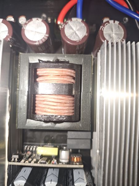 Судя по фото, не наблюдаю на ТПИ внешнего экрана, хотя обычно в нормальных мощных ИБП на ТПИ обычно ставят внешний экран из медной фольги. Даже на ТПИ приличных импульсных зарядых устройств от сотовых ставят внешний экран из короткозамкнутого витка провода. На плате зарядки поверх ТПИ виден КЗ виток провода, выполняющий роль экрана: