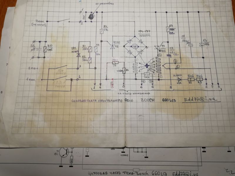 Добрый день, чтоб не создавать лишнюю тему, написал тут, всех с прошедшими праздниками, проблема такая с феном, перестал включать поток горячего воздуха, при включение на первое положение, включается обдув, на дисплее 50гр и можно производить регулеровку скорости потока, при включение второго положения, иногда проц запускает подогрев, экран работает, температура, память, все работает, а в основном, этого не происходит и он ведет себя так, как будто он включен на первом положение, Чтобыло сделано, -проверил переключатель (исправен) -проверил цепь питания симмистора, (напряжения в норме) -проверил цепь управления вторым положением, после диода идет около 88в со средней точки делителя напряжения, выход Мв, -сопротивление 1 ноги платы управления (где заходит сигнал о включение 2 положения) 144 Ома что я думвю достаточно мало, - визуально повреждений не нашел, нагрева нет, Кто что посоветует глянуть? под микроскопом не пропая не нашел... схему силовой части прилагаю, Все номиналы резисторов соответствуют, 5 вольт на пямяти присутствуют.