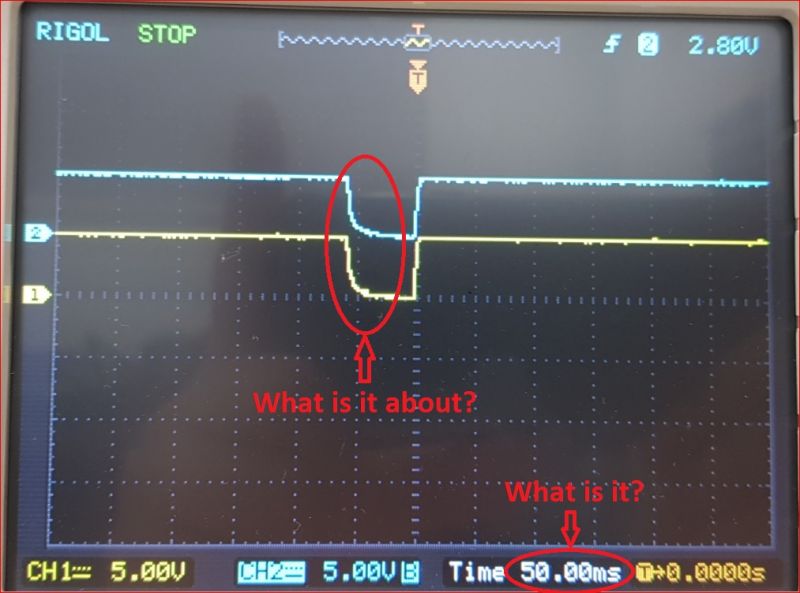 Для включения дебага нужно просто прочесть мануал на MPLAB X IDE. Там нет ничего сложного. Просто нажать на кнопку меню. Но это лирика... А по существу могу вам сказать следующее. Вы НЕ УМЕЕТЕ пользоваться измерительными приборами. Вы понимаете, что развертка осциллографа должна соответствовать ожидаемым таймингам сигнала? Ваши фото на микрочип.ком выглядят как издевательство над здравым смыслом, а тут как издевательство над другими пользователями форума. Во первых, следует постить картинки, которые можно смотреть, а не скроллить их по частям, когда на экране видно не более 5% изображения. Во вторых, вы настроили I2C на 100 кГц, то есть бит передается с клоком в 10 мкс. Вы, ничтоже сумняшеся, публикуете на микрочипе фото с разверткой 50 МИЛЛИсекунд/деление. То есть один клок сигнала составляет 1/5000 часть ОДНОЙ КЛЕТКИ на экране осциллографа. Вы вообще понимаете что делаете? Тут вы пошли еще дальше и установили развертку в полсекунды на деление... ЗЫ. Как войти в дебаг (прямо на мое сообщение): https://radiokot.ru/forum/viewtopic.php ... 9#p3543649 - это куда жать Но вначале нужно в свойствах проекта выбрать инструмент отладки (тот который у вас).
