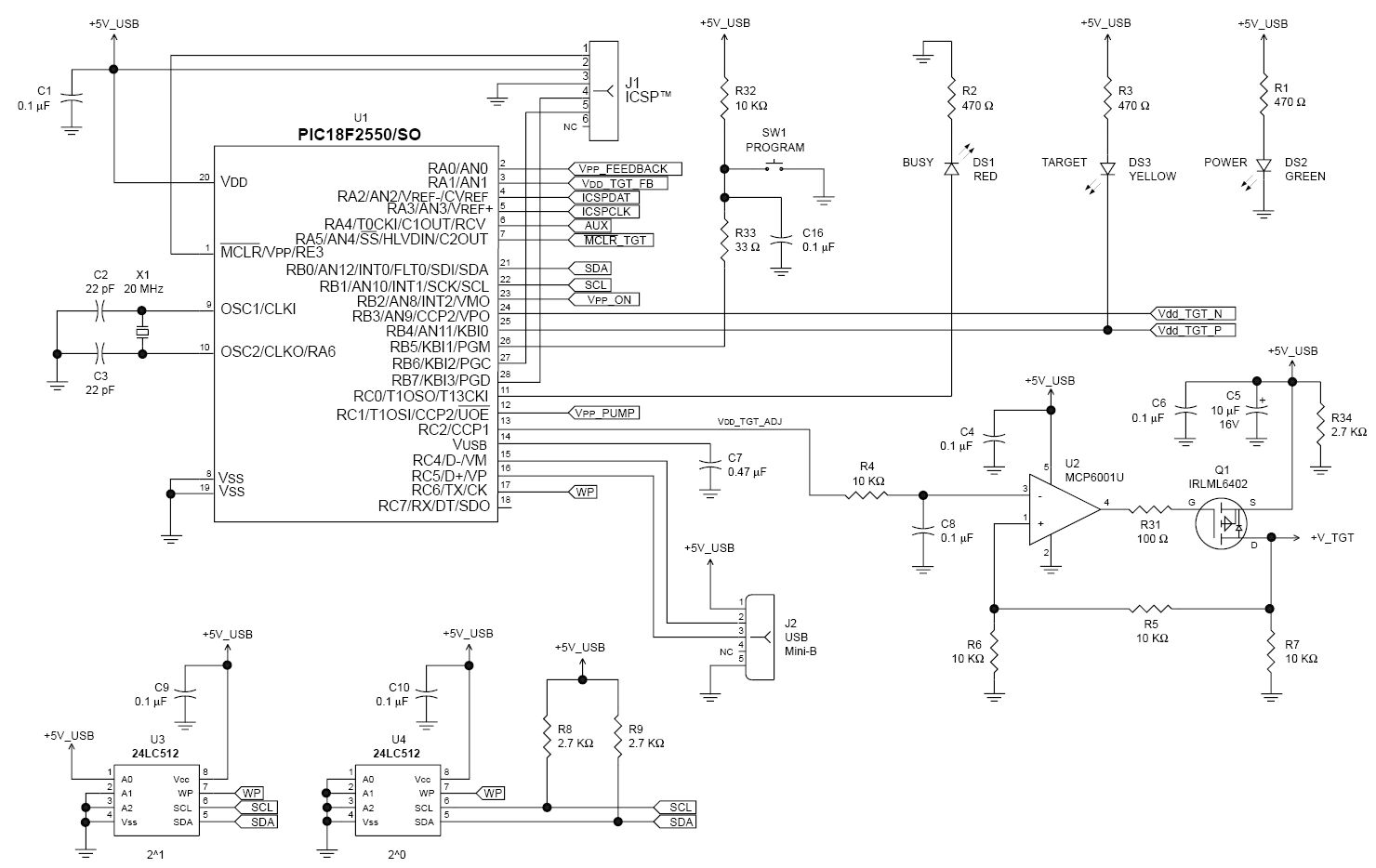 Добрый день, Друзья. Очень надеюсь на вашу помощь, т.к. свой мозг я уже высушил. Собрал сей чудо-программатор по схеме с официального сайта (Shema_PICkit2_1.jpg + Shema_PICkit2_2.jpg). Все картинки и скриншоты во вложении. При запуске PICKit 2 Programmer выскакивает ошибка VDD Voltage level error. (problem_pic1.gif) Целевое программируемое устройство не подключено.(на самом деле без разницы, ведь даже если подключить программируемый МК ничего не изменится, будет та же ошибка) problem_pic2.gif => программатор определился и подключён. Далее я залез в Troubleshooting и problem_pic3.gif - тест VDD пройден, но ПРИМЕЧАНИЕ: медленное время роста может служить причиной ошибок. Далее, с первого раза тест VPP не проходит, а говорит о коротком замыкании в цепи VDDproblem_pic4.gif. Если ещё раз нажать на кнопку Test VPP, то тест проходит (все остальные разы без проблем проходит) problem_pic5.gif. /MCLR On - замер тестером даёт 0 В. /MCLR Off - замер тестером даёт 1,9 В. problem_pic6 (Vtri-state=1,9 V).gif Step 3: Verify PGC + PGDproblem_pic7.gif мерил тестером всё в норме. Подключал PIC18F2550 без обвязки к программатору, т.е. шесть проводков (две земли Vss, питание Vdd, Vpp или /MCLR, PGC и PGD) => устройство не видит, не читает, не определяет. В схеме менял R30 и R31 на 0 Ом => не помогло (без изменений ведёт себя программатор). По цепи +V_TGT стоят один электролит 10 uF и две керамики по 150 nF (после дросселя 680 uH электролит 47 uF). Выкусывал электролит 10 uF => не помогло. Подскажите, пожалуйста, где мне искать проблему.