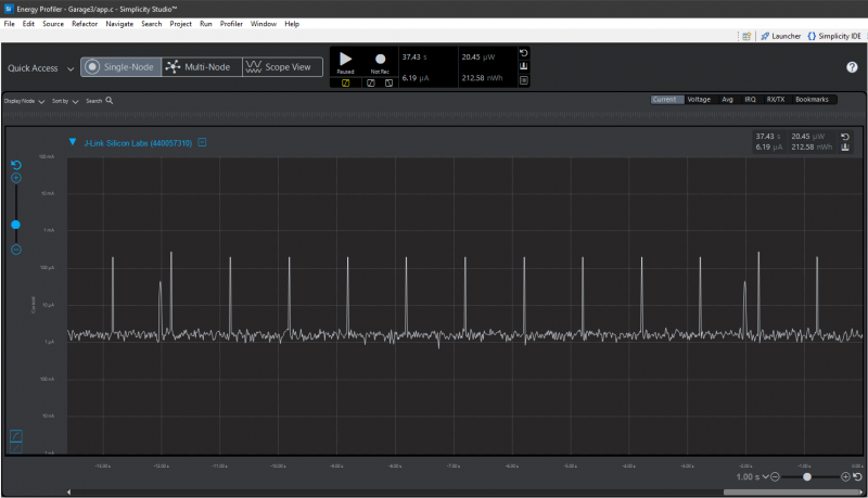 Результаты об издыхающих батарейках интересные и оригинальные. Нигде подобного не встречал. Спасибо! Перечитал несколько последних сообщений в теме и осознал, что многое за последние 4 года изменилось. Прежде всего, потребление современных BТ модулей на мощности 0dBm снизилось до уровня 2-4мА у разных моделей. В пересчёте на работу броадкастера с периодом 1 сек, его среднее потребление стало ниже саморазряда алкалиновых батареек. На картинке для примера показано потребление моего датчика слежения за положением двери гаража на основе силлабовского модуля BGM220. Каждую секунду он передаёт температуру в гараже и положение двери, которые измеряются с периодом 10сек сенсором TMP112 и акселерометром LIS2DE12. В остальное время всё спит. Пики потребления, конечно выше при более детальном их рассмотрении, но измеренное Студио среднее потребление оказалось 6.2 мкА. Он у меня питается напрямую от CR2032 (под платой на снимке). Спойлер Средства разработки также шагнули вперёд. Сайпровская студио, которую я ранее считал идеалом для БТ разработок отодвинулась на задний план. Силлабы сделали огромный шаг вперёд в плане улучшения их Simplisity Stodio v5 и сейчас она для меня N1. Подумываю написать статью про неё, так что здесь пока коротко. Следут упомянуть также изменения в технологии самих чипов. Многие фирмы перешли на 40нм технологию, на архитектуру Cortex-M33, и на двухядерные BT модули, где одно ядро CM0+ задействовано исключительно под нужды БТ стека. Всё это способствует понижению энергопотребления.