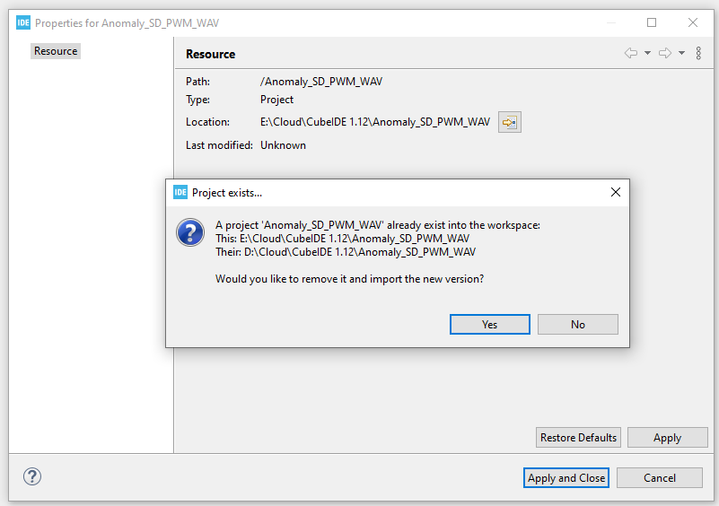 Вернулся на первый комп, и нормально открылся проект. Но так же самая ошибка при попытке открыть проект со второго компа. У обоих файл .project есть в папке. Причем я провел сравнение - файлы одинаковые, за исключением названия проекта. Папки синхронизируются через облако, и в целом, файлы .project целостные - открываются блокнотом, и читаются. Единственное различие между папками на двух компах - путь к ним. На одном ПК она находится на диске D, а на другом - E. Значит, меняю букву диска, и о чудо - открылся проект со второго компа, но не открылся - с первого... Поменял обратно, залез в Properties... И там указан полный путь к проекту, естественно, на другом диске. Пробую поменять, а Cube мне не много - не мало, предлагает аж ПЕРЕЗАПИСАТЬ проект... Но интересно другое - откуда Cube взял путь? Решил порыться в файлах - все они открываются блокнотом, но нигде никакого пути нет. Разве что в файле \.settings\stm32cubeide.project.prefs какие-то непонятные данные. Возможно, там путь и закодирован?