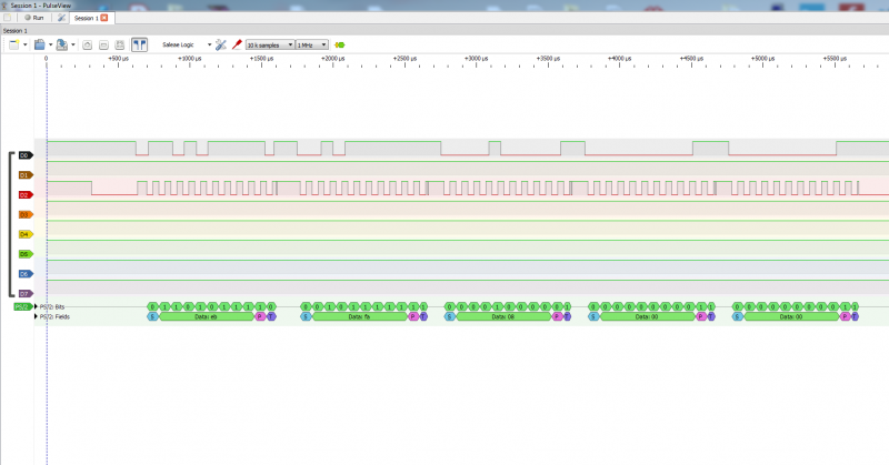 https://drive.google.com/file/d/1SO5TpS ... sp=sharingЛогическим анализатором я снял дамп работы с тачпадом во время "покоя", то есть пальцем его не трогать. Отчетливо видно что передается 5 пакетов, но во всех примерах считывание идет только 3 раза. Для тестов а подключал большой тачпад (правый верхний), он так же имеет кнопку. Кнопка подключена к контроллеру но ее нажатие никак не передается....